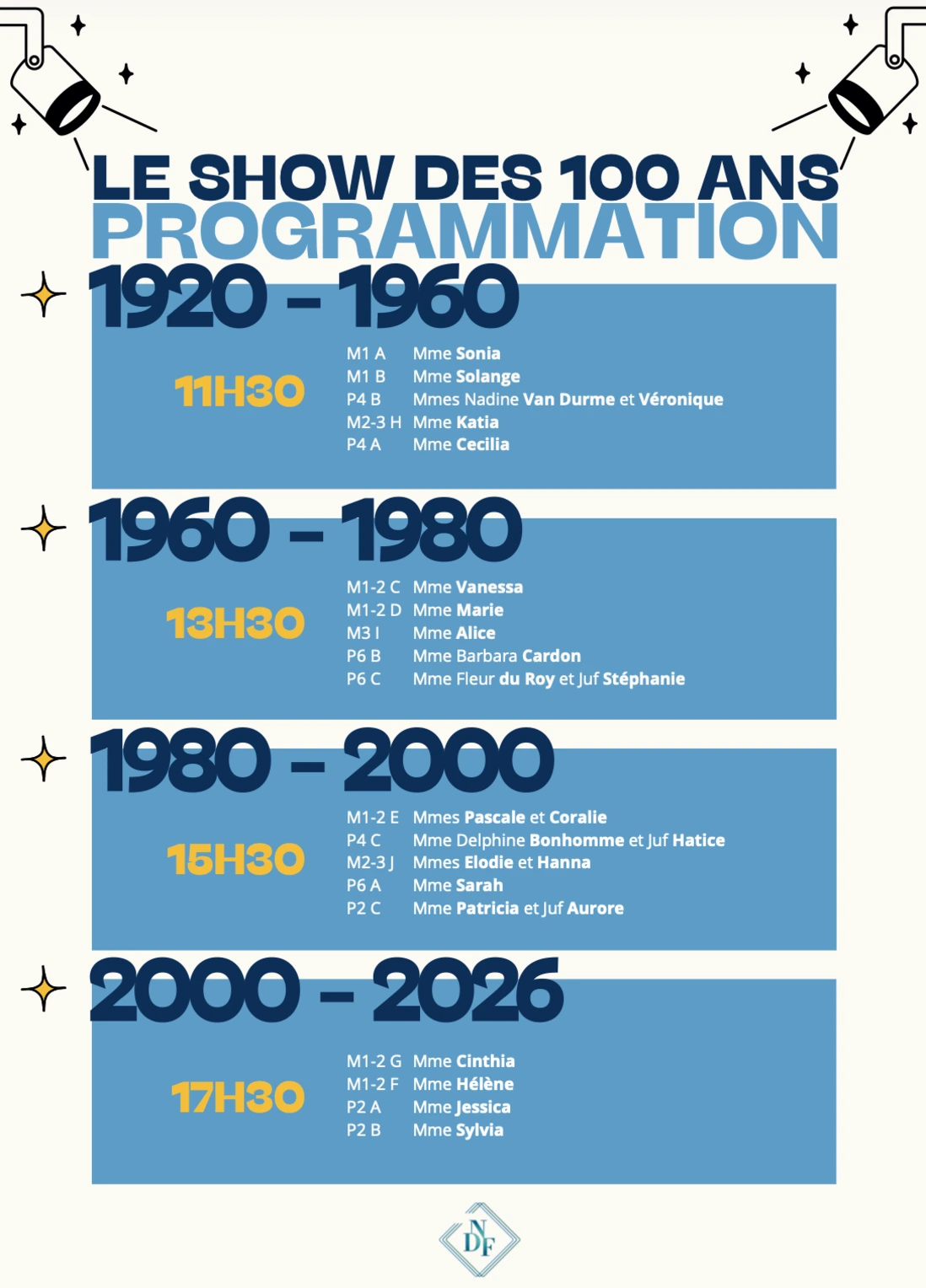 Les élèves et leurs enseignants sont fiers de vous inviter à la Journée « Grand Show des 100 ans », un événement festif, haut en couleurs et riche en émotions ! Tout au long de la journée, laissez-vous emporter par une succession de spectacles dynamiques, créatifs et surprenants, mettant à l’honneur le talent de nos élèves.